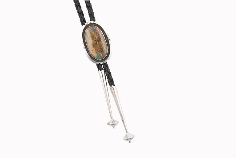Royston Boulder/Ribbon Turquoise Pear Stone On Crimped/Twisted .925 Ss Bolo Tie With 44″ Black Leather Scott Skeets – Navajo