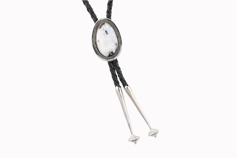 White Buffalo Triangular Stone On Crimped/Twisted .925 Ss Bolo Tie With 44″ Black Leather By Scott Skeets – Navajo