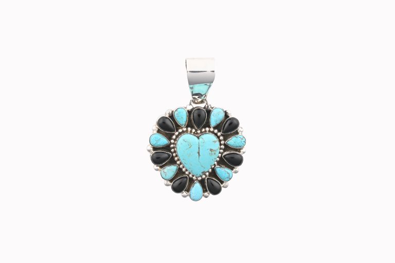 Manassa Turquoise & Black Onyx Heart & 7 Pear/5 Oval Stones On .925 Ss Pendant By Myron Begay/Renae Frank (Navajo)