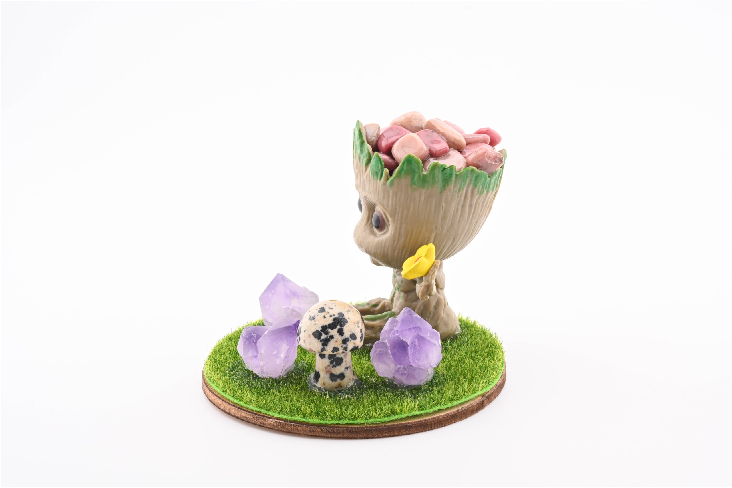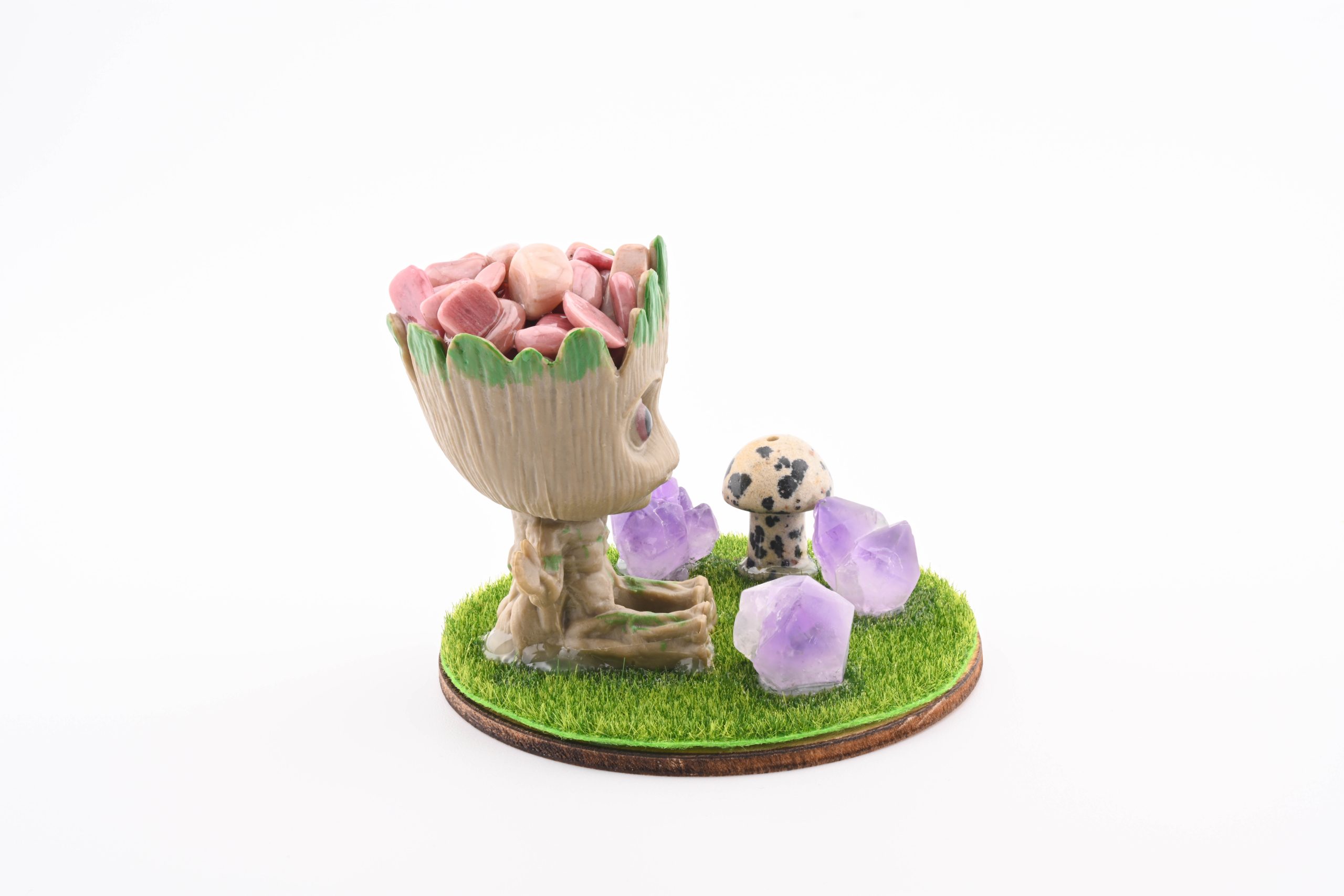 Baby Groot With Stone Chips In Resin, 3 Amethyst Points & Assorted Mini Mushroom – Rhodonite From Russia