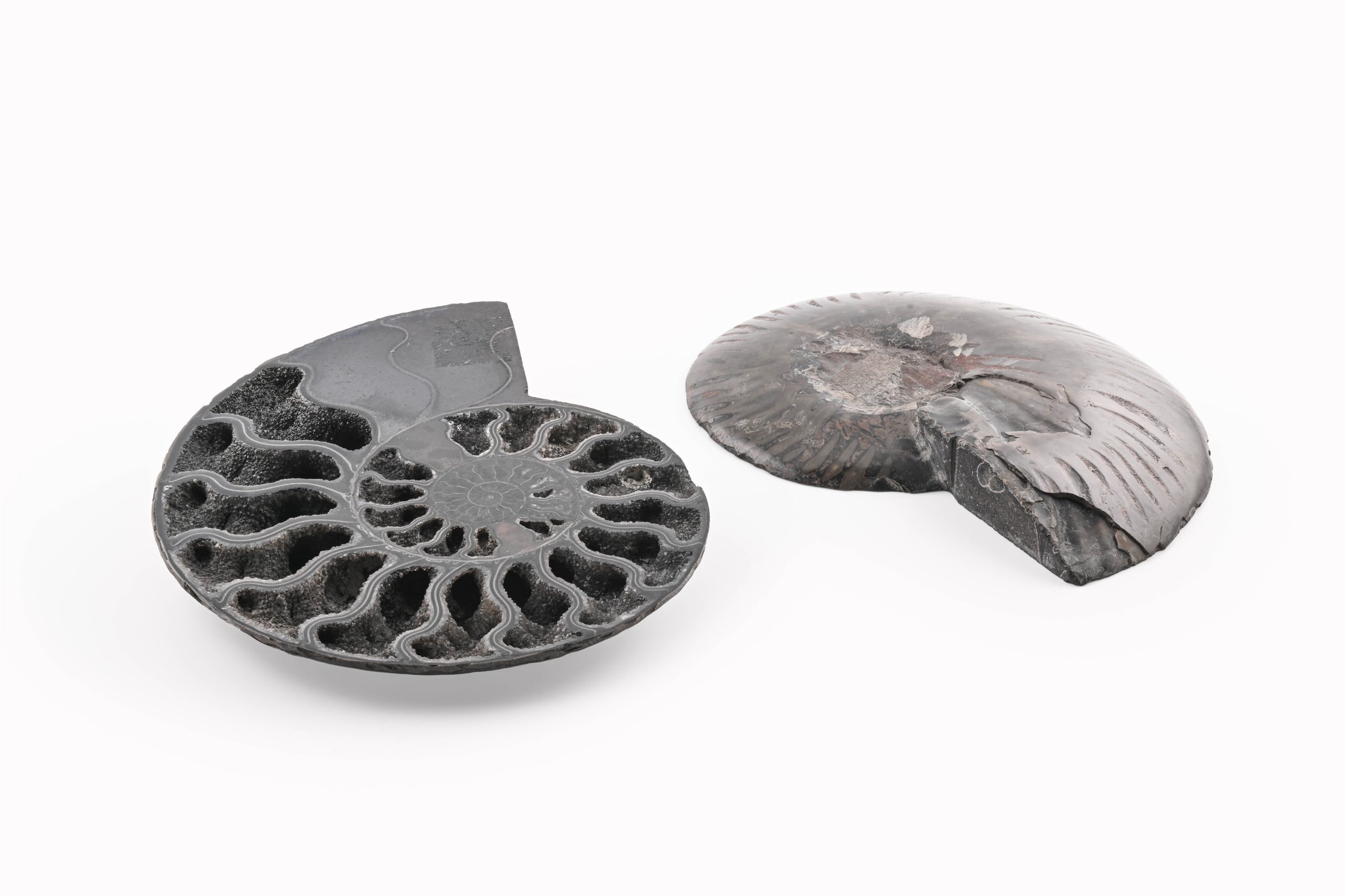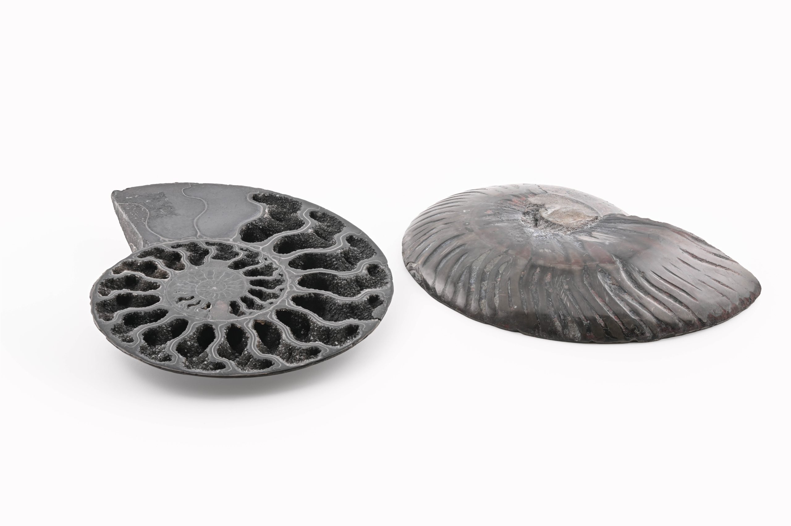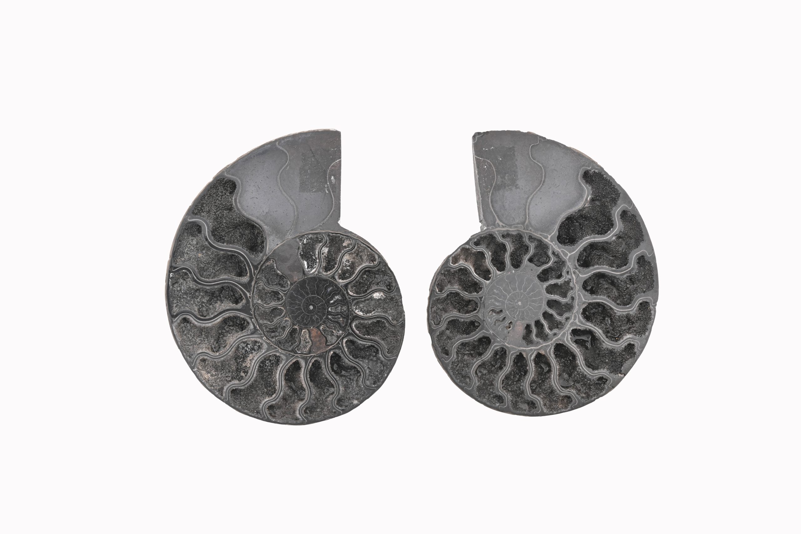 Black Ammonite Fossil With Calcite Polished Halves From Madagascar