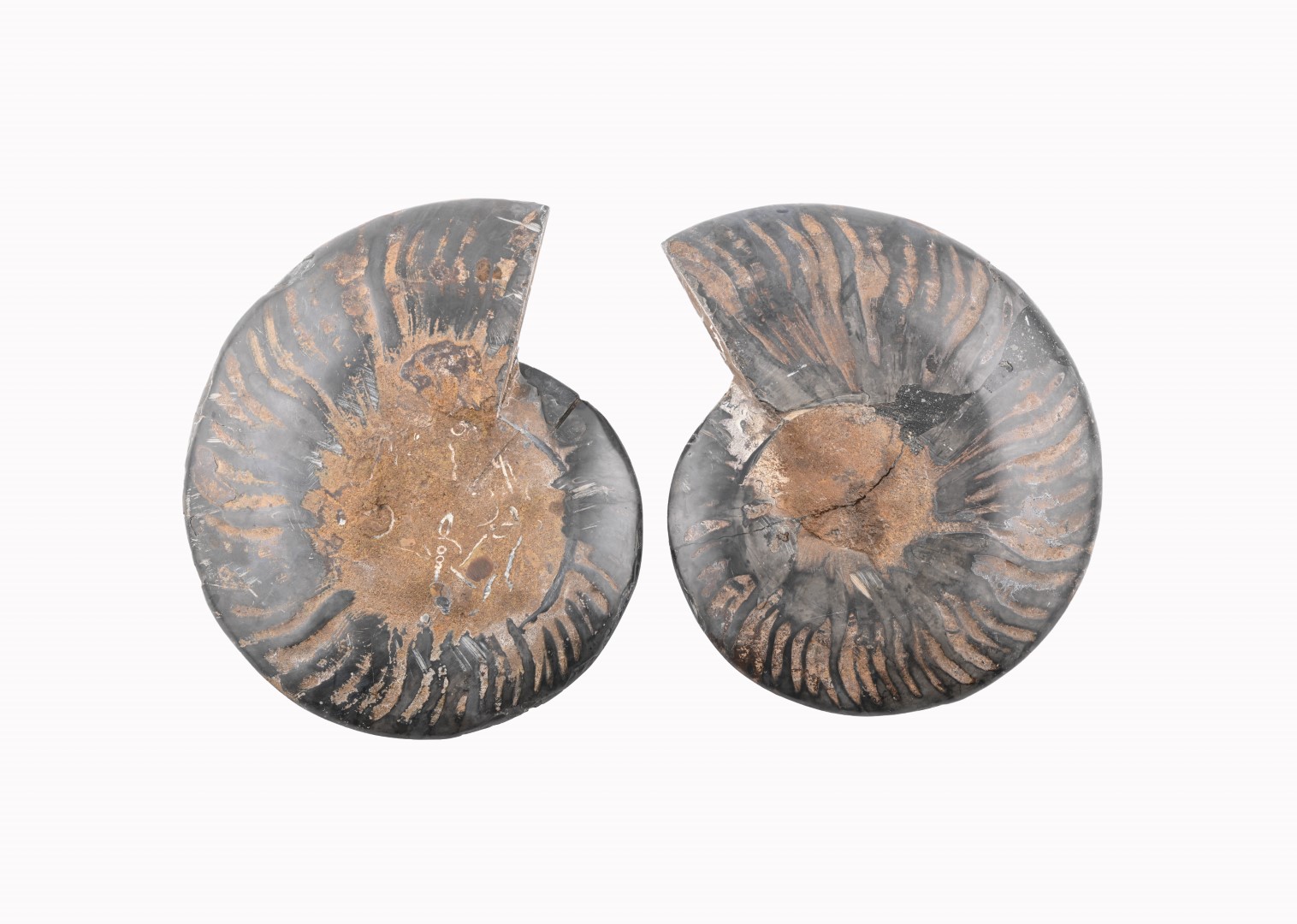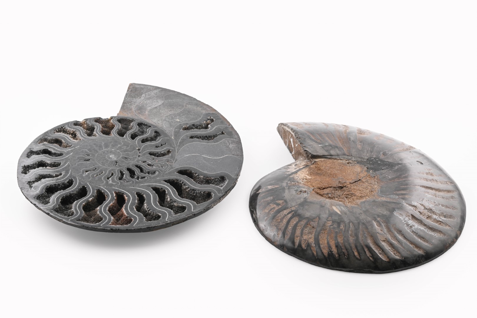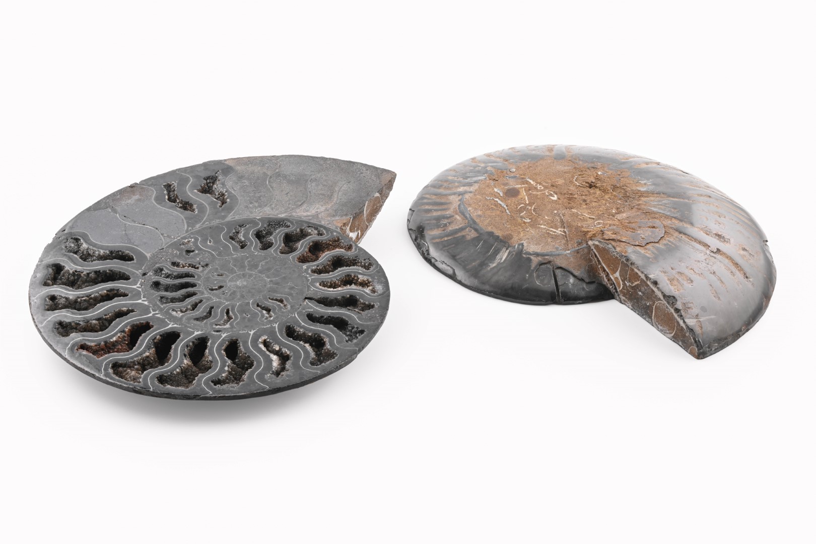 Black Ammonite Fossil With Calcite & Pyrite Polished Halves From Madagascar