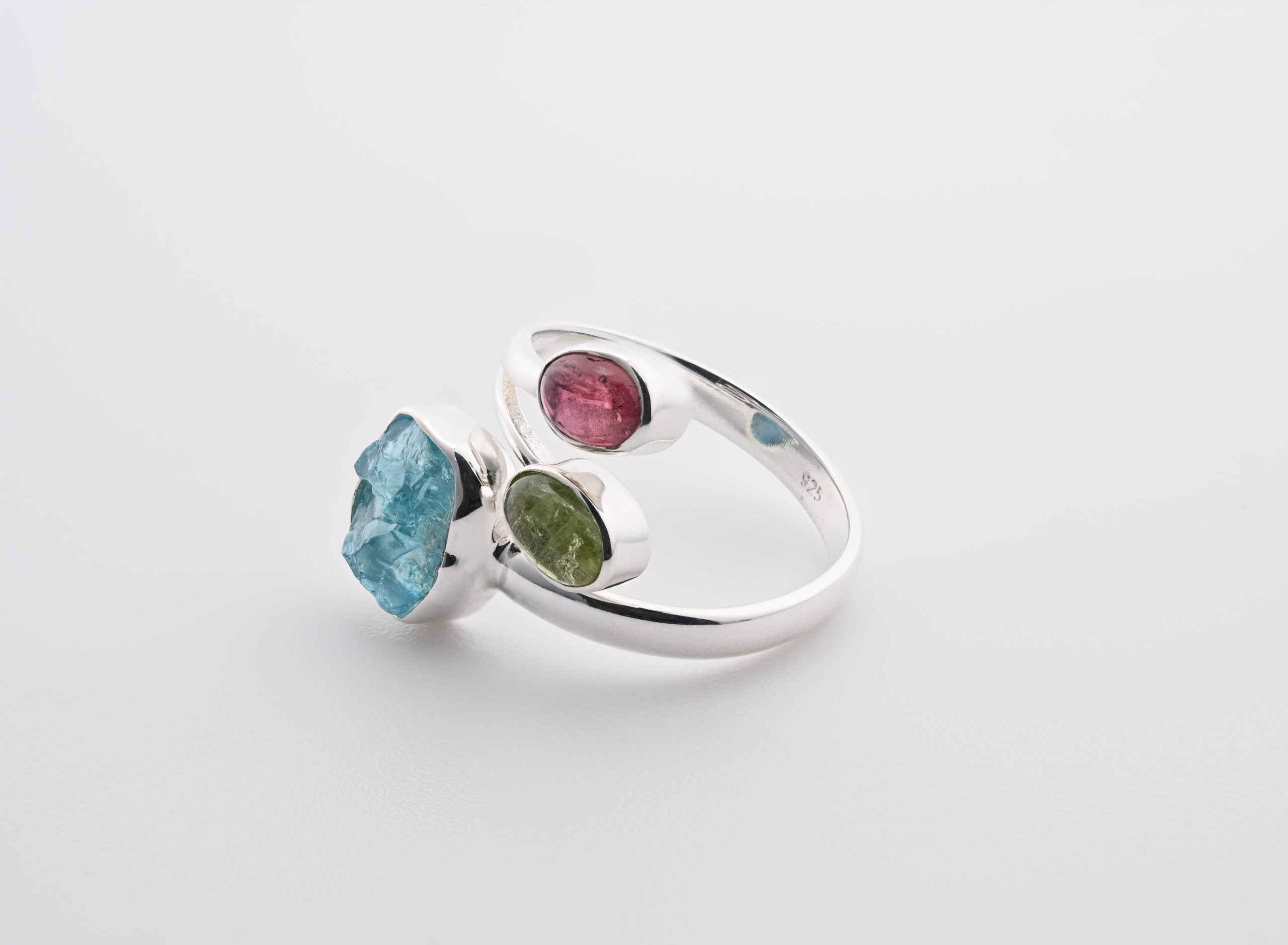 Blue Apatite ( Madagascar) Rough, Polished Vedelite & Rubellite Tourmaline Stones On .925 Ss Adjustable Ring Size 7