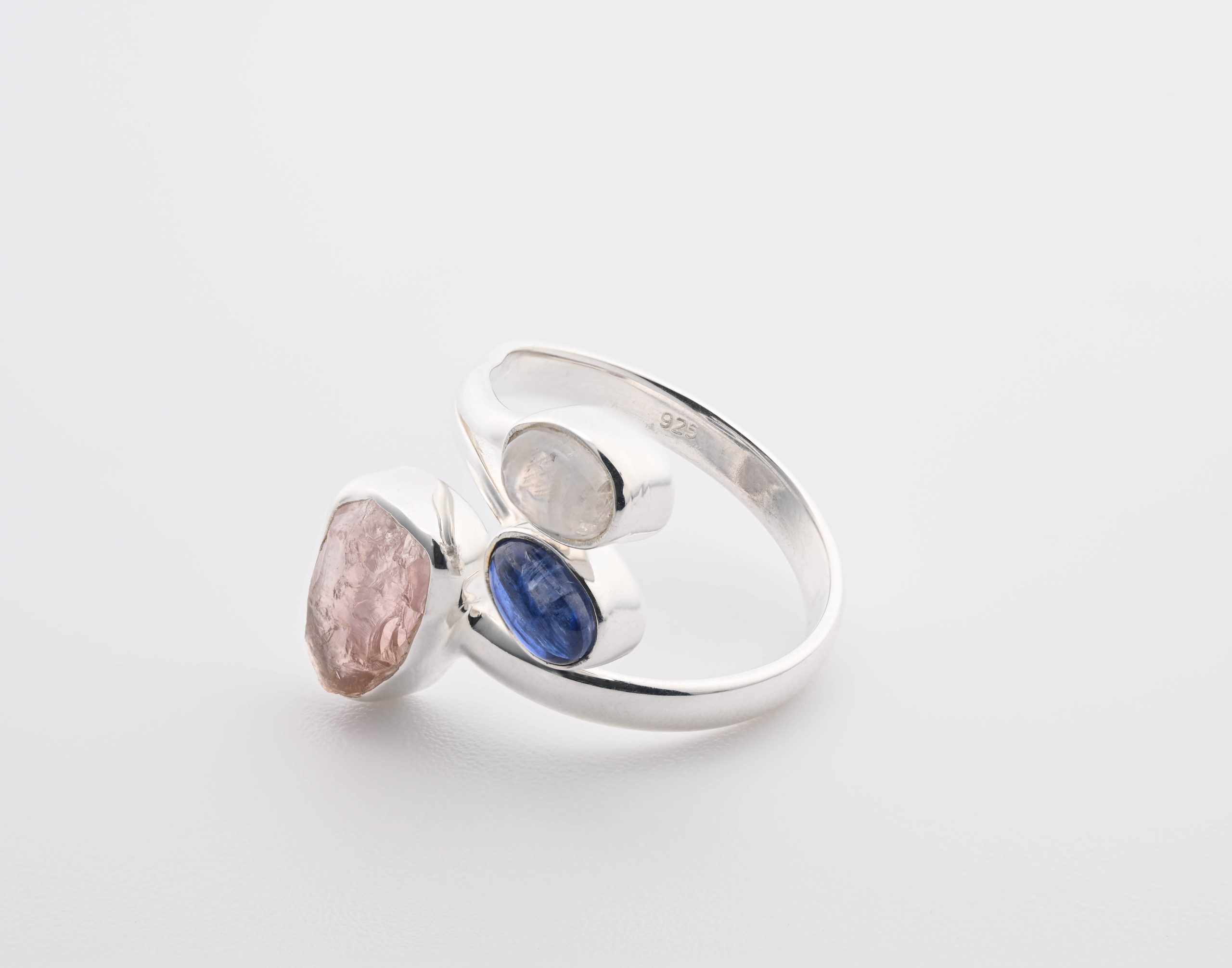 Blue Kyanite (Brazil), Moonstone (India) Polished & Tanzanite (Tanzania) Rough Stones On .925 Ss Adjustable Ring Size 7.5