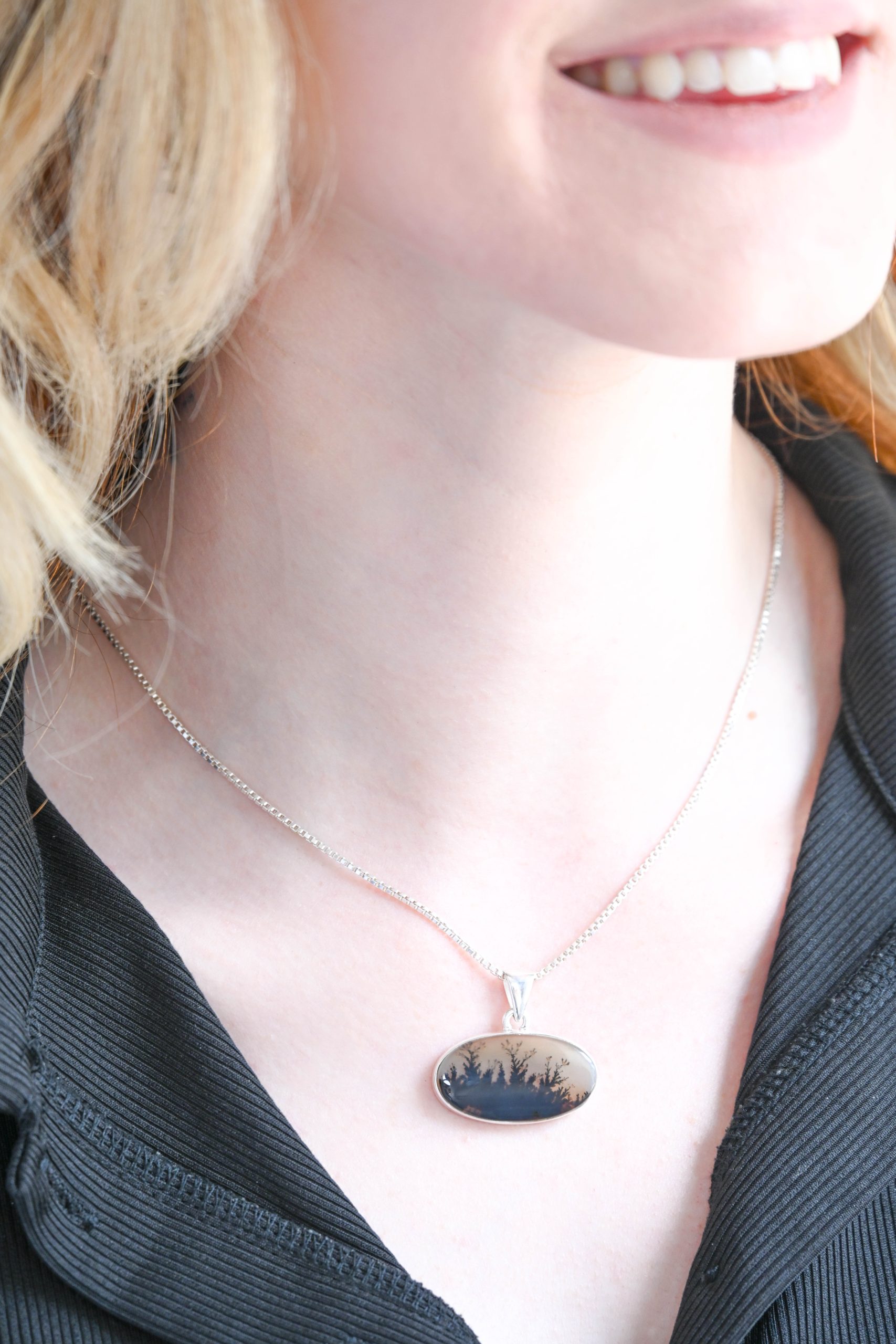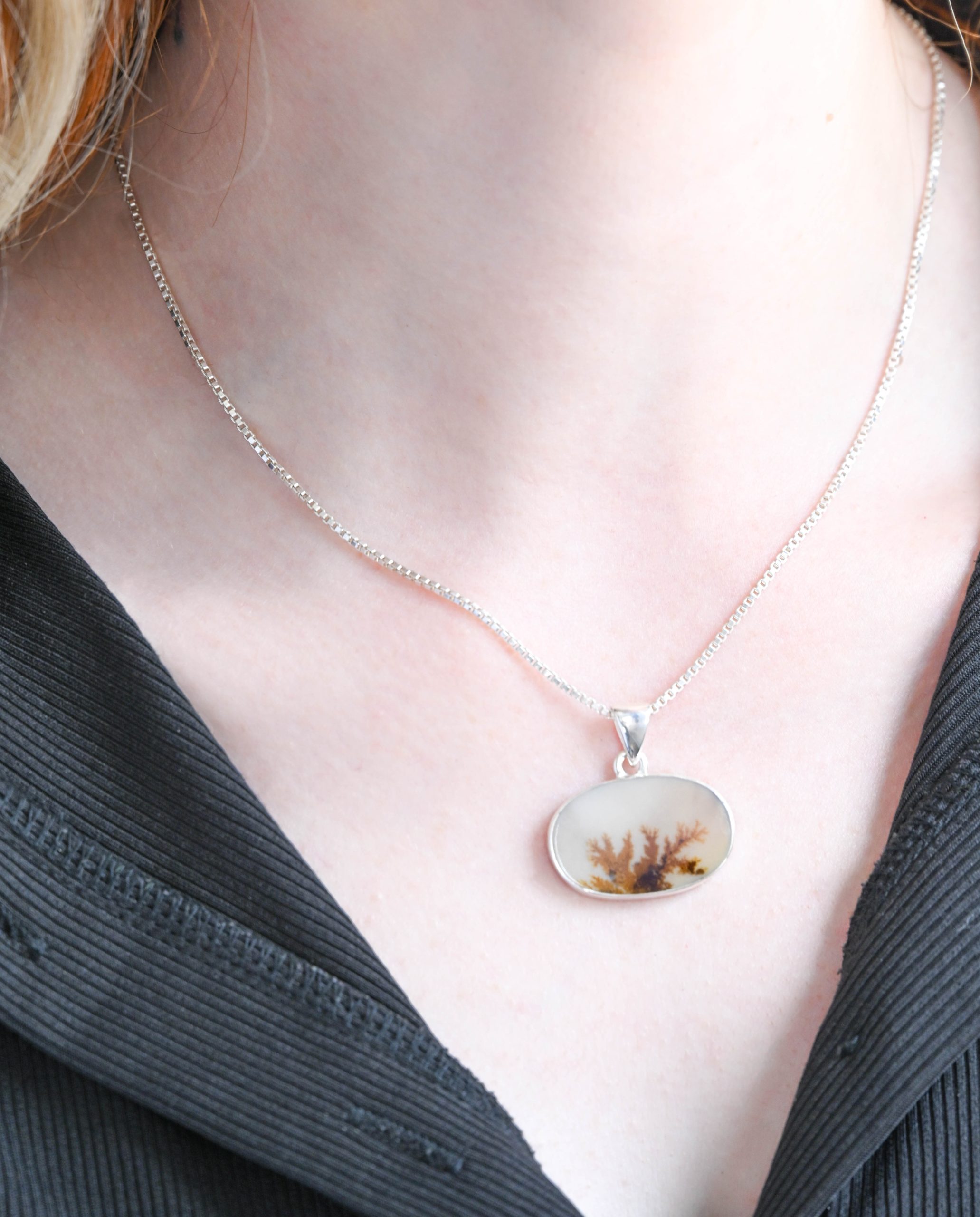Dendritic Agate (India) Polished Stone on 0.925 Sterling Silver Pendant – Medium Oval Stone