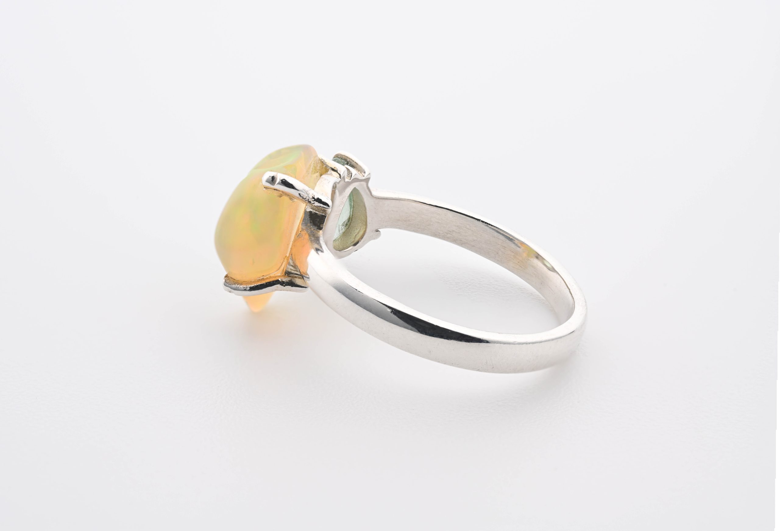 Green Kyanite Polished Teardrop (Brazil) & Welo Opal (Ethiopia) Polished Stones On Double 4-Prong 0.925 S.S. Setting Ring 6.75