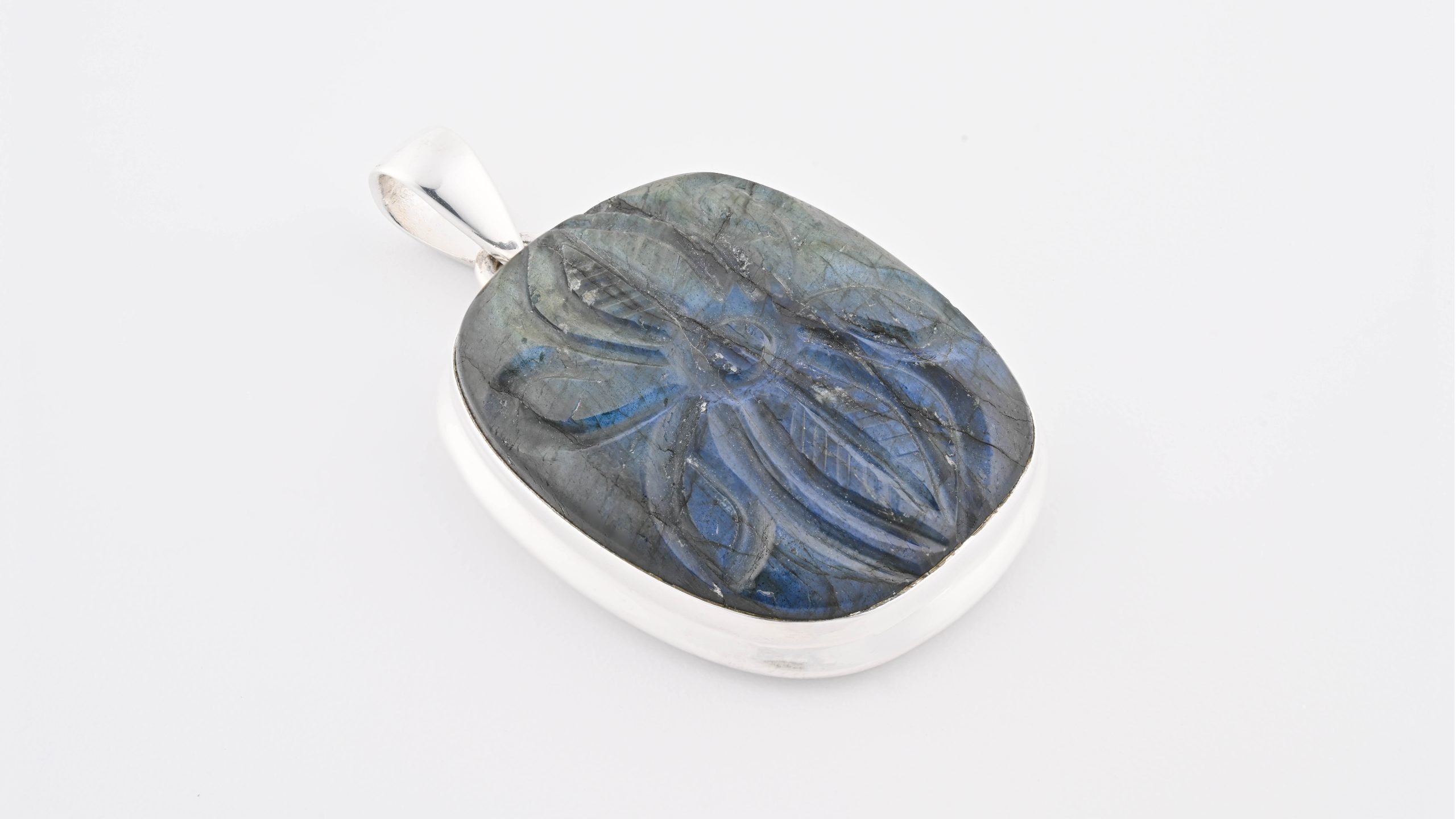 Labradorite (Madagascar) Carved Stone on 0.925 Sterling Silver Pendant – Jumbo Rectangular Stone with Flower