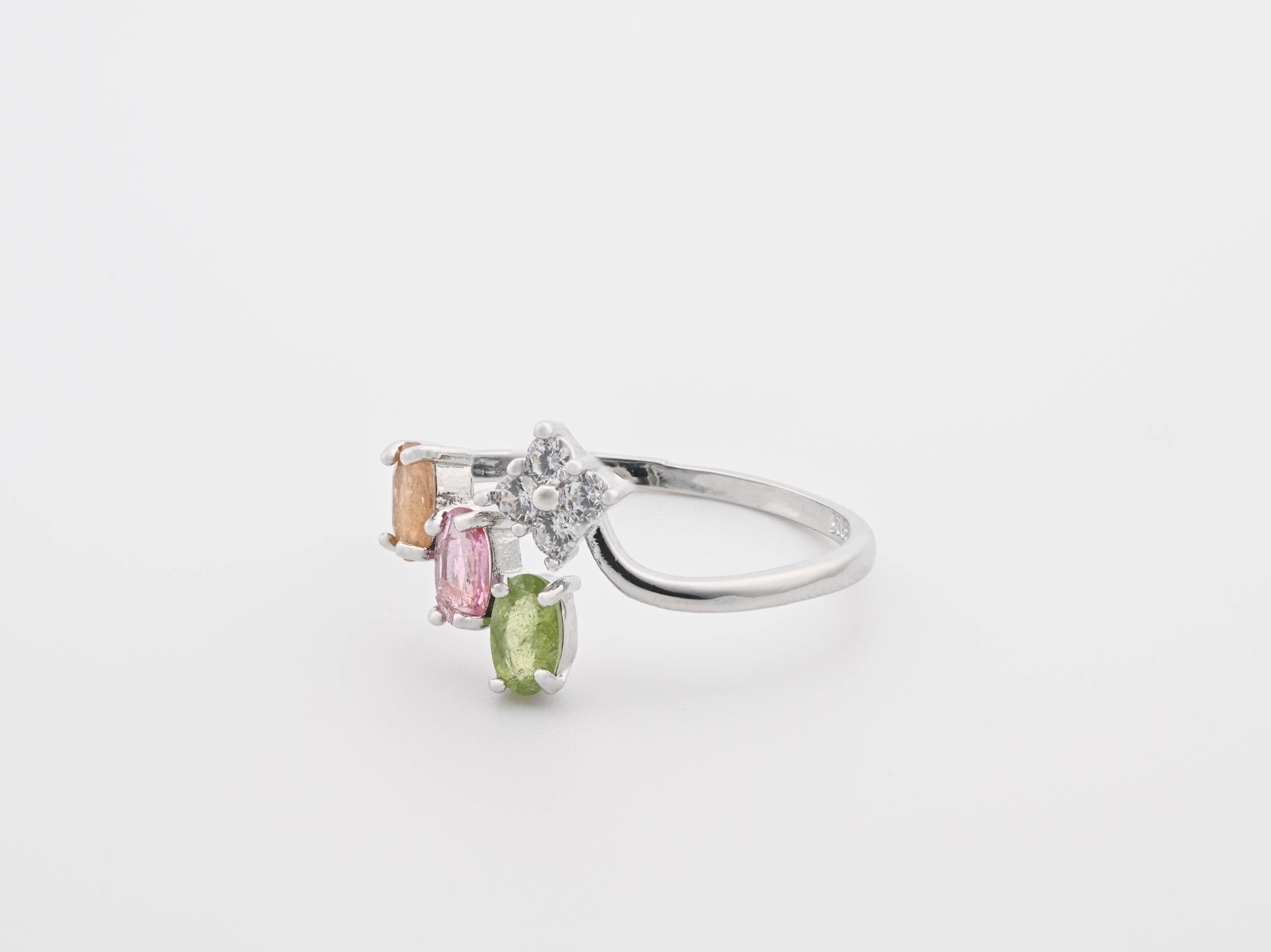 Mixed Tourmaline 3 Faceted Brilliant Oval Stones & 4 Cubic Zirconia Brilliant Stones On .925 Ss Adjustable Band Ring
