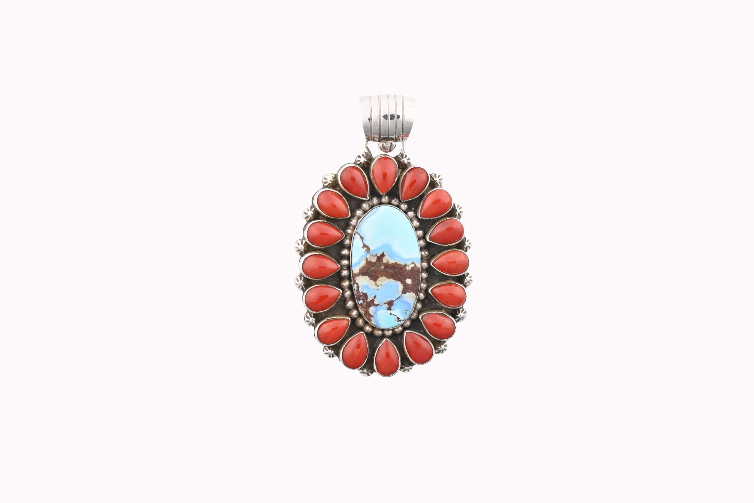Red Italian Coral (16 Pear) & Golden Hill Turquoise Oval Stones On .925 Ss Cluster Pendant By Lucinda Whitegoat (Navajo)