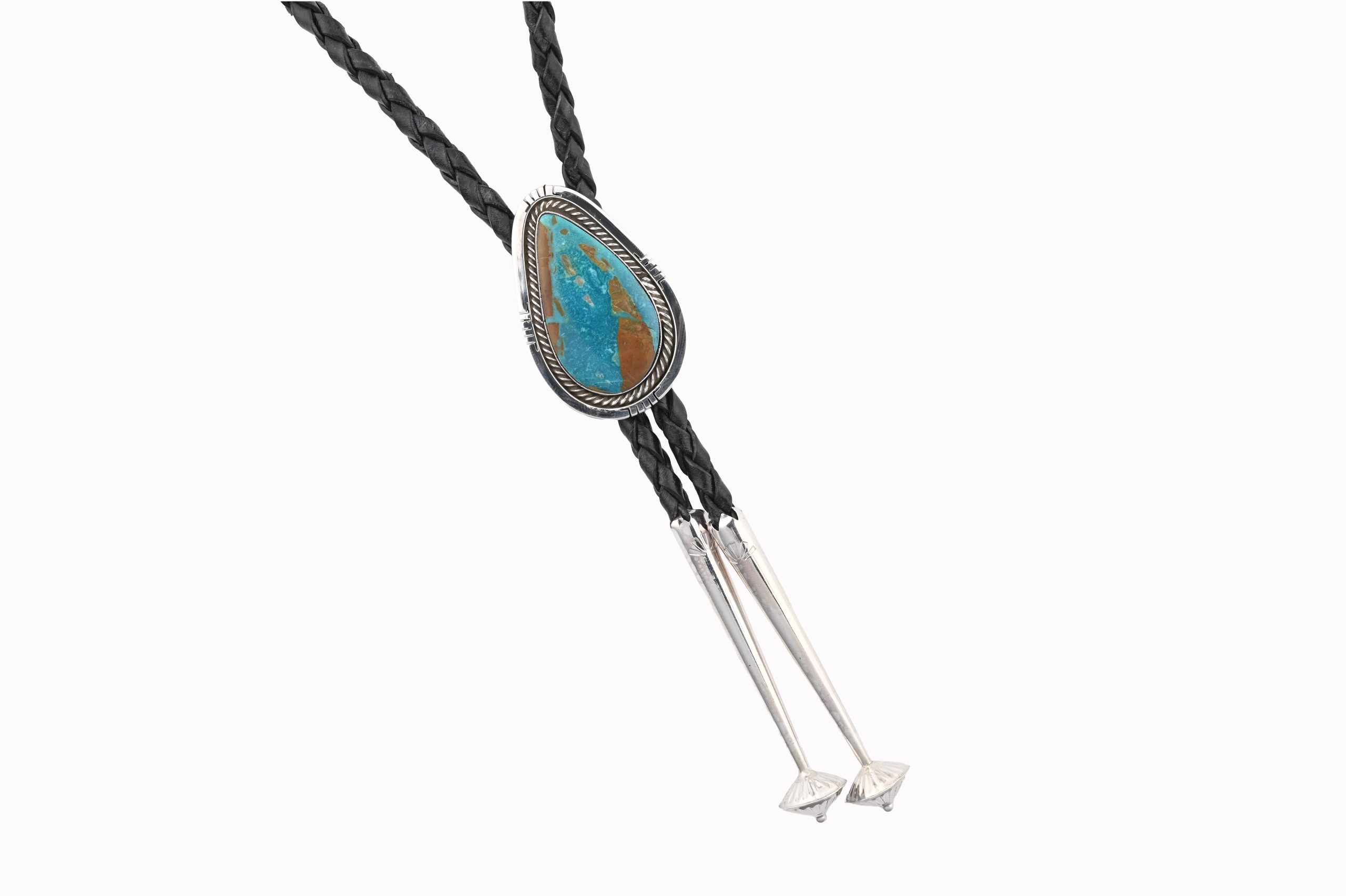Royston Boulder/Ribbon Turquoise Pear Stone On Crimped/Twisted .925 Ss Bolo Tie With 44″ Black Leather Scott Skeets – Navajo