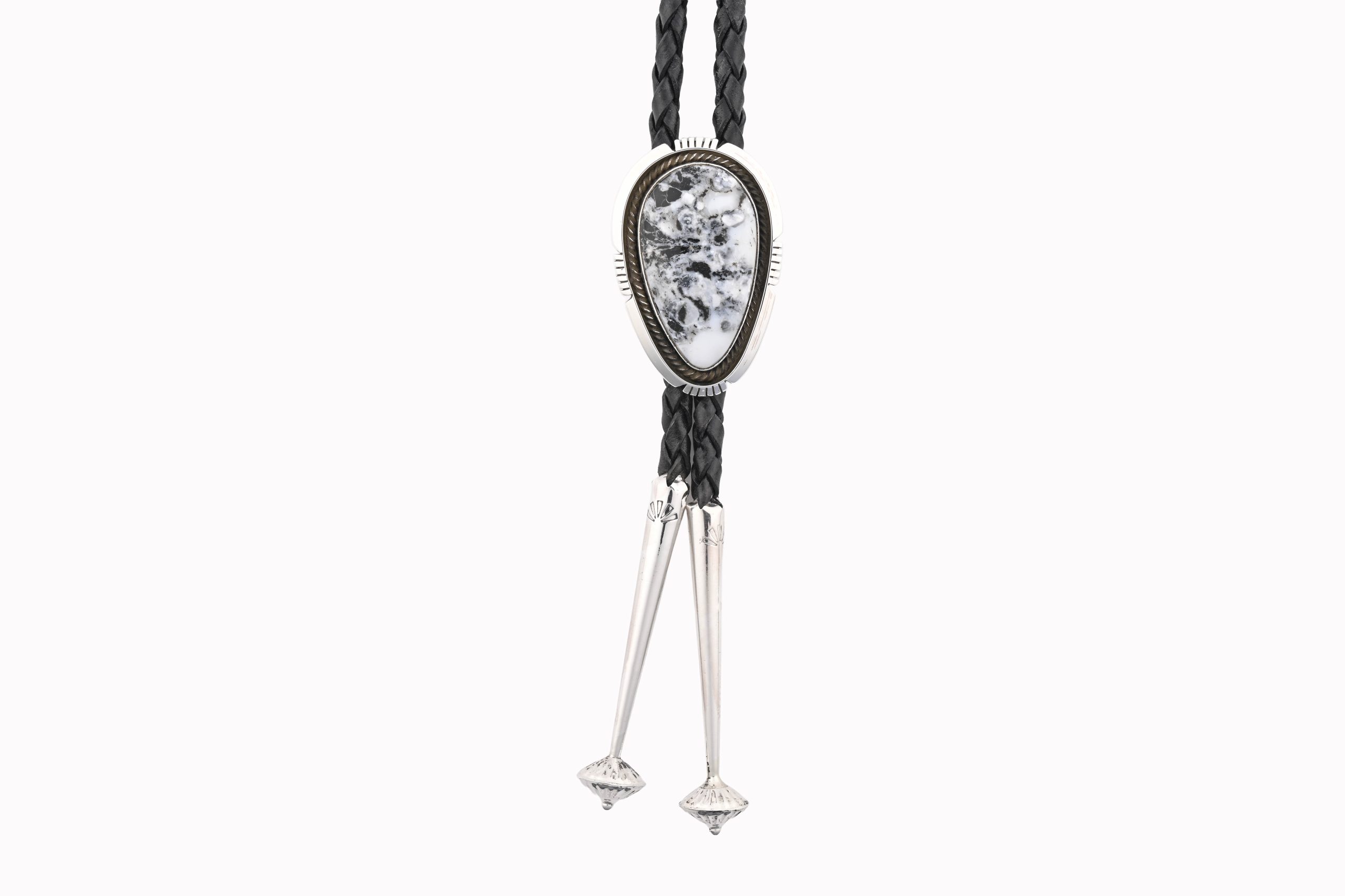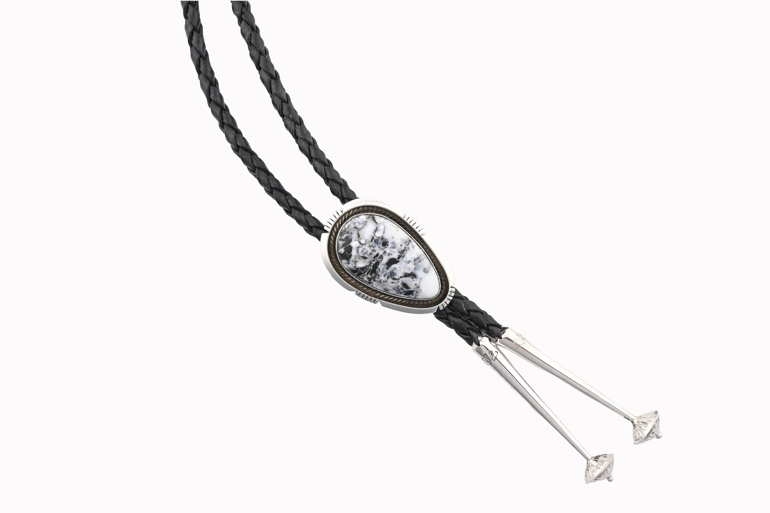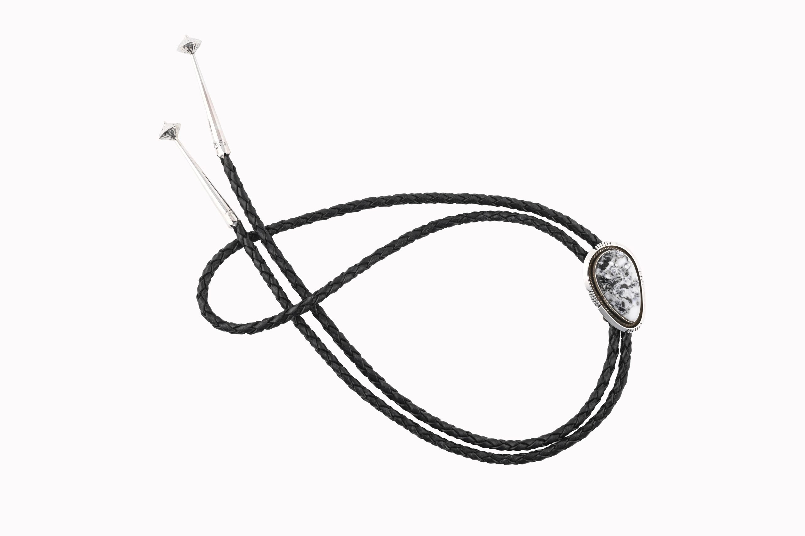 Be the first to review “White Buffalo Pear Stone On Crimped/Twisted .925 Ss Bolo Tie With 46″ Black Leather By Scott Skeets – Navajo”