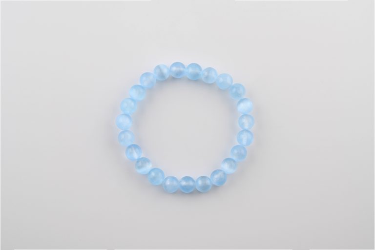 Blue Selenite (Satin Spar) 8-9Mm Polished Round Beads On 7.5″ Length Elastic Beaded Bracelet From Morocco