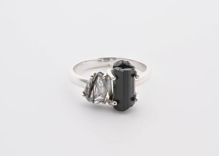 Double Stone Polished Tourmalinated Quartz (Sri Lanka) & Rough Schlor (Brazil) On 0.925 Sterling Silver Ring Size – 7
